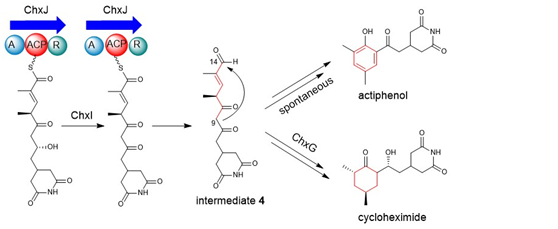 至此,CHX和APN的生物合成途徑的細(xì)節(jié),包括六元碳環(huán)系統(tǒng)的生物合成的新機(jī)制得到了完整解析。本研究表明,CHX和APN并非如先前推測(cè)的那樣由APN催化氫化產(chǎn)生CHX,而是自trans-AT PKS合成了碳骨架后,通過(guò)兩個(gè)平行的途徑分別產(chǎn)生的。兩種氧化還原酶(ChxJ和ChxI)可以單獨(dú)產(chǎn)生一種活性中間體,該中間體經(jīng)歷一系列非酶轉(zhuǎn)化以產(chǎn)生APN,而還原酶(ChxG)則作為看門(mén)人,將同一中間體引導(dǎo)到產(chǎn)生CHX的合成途徑。該研究對(duì)作者團(tuán)隊(duì)于2014年提出的假設(shè)(Yin et al. Org Lett, 2014)進(jìn)行了進(jìn)一步修正,擴(kuò)展了對(duì)天然產(chǎn)物生物合成中氧化還原酶介導(dǎo)的酚和環(huán)己酮基團(tuán)形成的理解,并為未來(lái)的組合生物合成研究奠定了基礎(chǔ)。
