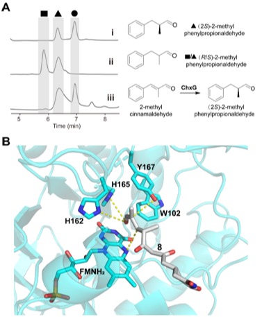 ChxJ和ChxI的組合足以產(chǎn)生APN,而ChxH和ChxG對(duì)于CHX的生物合成至關(guān)重要,這與作者早期的體內(nèi)敲除實(shí)驗(yàn)結(jié)果一致。ChxH負(fù)責(zé)CHX生物合成途徑的最后一步已經(jīng)在先前報(bào)道的文章中證實(shí),接下來(lái)重點(diǎn)研究ChxG。實(shí)驗(yàn)結(jié)果顯示,化合物8能被ChxG還原為化合物9(圖3A),這表明ChxG在CHX生物合成中的作用是介導(dǎo)不穩(wěn)定的醛化合物4的C12-C13雙鍵還原,生成新的中間體10,該中間體隨后可自發(fā)進(jìn)行醛醇縮合脫水生成11(圖3B、圖4)。隨后將ChxJ、ChxI和ChxG組合在一起,以3為底物進(jìn)行了一鍋反應(yīng),證明了化合物4是ChxG的真實(shí)底物(圖3C)。而化合物11可以在非酶催化條件下轉(zhuǎn)化為化合物6(圖3D)。此外,找到了一個(gè)ChxG的同源蛋白,并通過(guò)體外實(shí)驗(yàn)驗(yàn)證了其具有ChxG相同的活性。驗(yàn)證了ChxG在底物還原過(guò)程中的立體選擇性與天然放線(xiàn)菌酮生物合成過(guò)程中C12和C13雙鍵還原時(shí)的立體選擇性是一致的(圖5A)。最后,通過(guò)分子模擬對(duì)接分析以及后續(xù)點(diǎn)突變蛋白的構(gòu)建,證明了氨基酸H162、H165和Y167對(duì)ChxG的還原活性起著至關(guān)重要的作用(圖5B)。