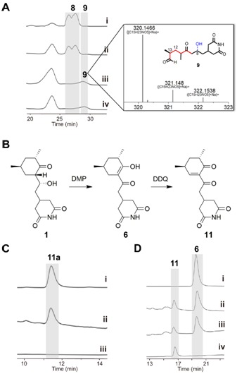 ChxG化合物8生成9。 (B)由化合物1(CHX)化學(xué)合成化合物11和6。(C) ChxI、ChxJ和ChxG與3孵育,11易于發(fā)生酮烯醇互變異構(gòu)生成11a。(D) NADPH在添加或不添加ChxG的情況下分別與11共孵育。