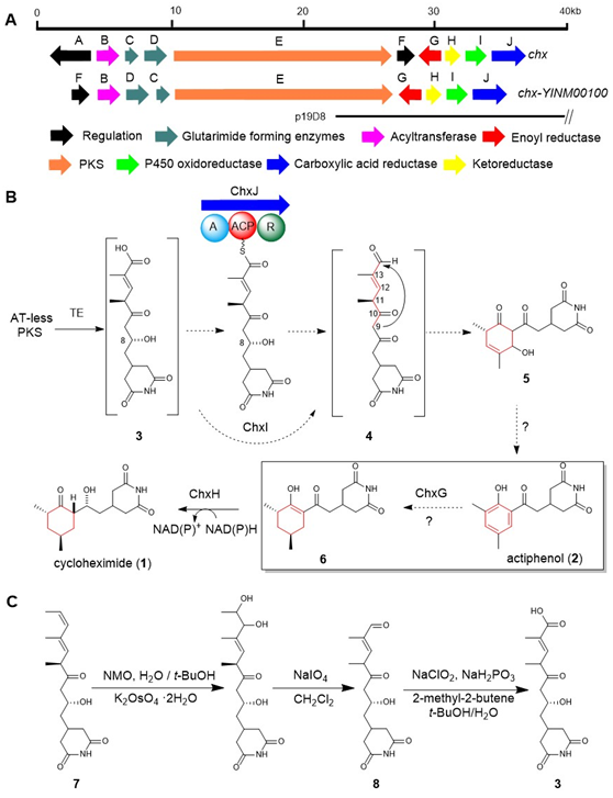 圖1:(A) chx和chx- YINM00100 BGC的基因簇比較。(B)前期研究提出的CHX和APN的生物合成途徑。(C)由化合物7化學(xué)合成化合物3和8