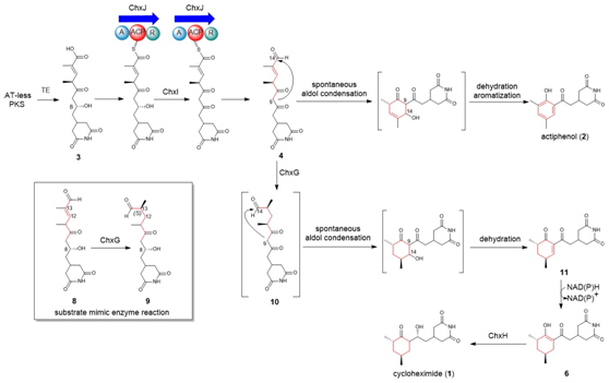 真核細(xì)胞翻譯抑制劑放線(xiàn)菌酮(cycloheximide, CHX)及其類(lèi)似物放線(xiàn)菌酚(actiphenol, APN)都具有特殊的戊二酰亞胺結(jié)構(gòu)和六元碳環(huán)側(cè)鏈基團(tuán)。APN與CHX的區(qū)別在于其含有芳香酚環(huán)而非環(huán)己酮基團(tuán)。在前期的天然產(chǎn)物發(fā)現(xiàn)工作中,作者注意到多株產(chǎn)生CHX的菌株能夠同時(shí)發(fā)現(xiàn)有APN的產(chǎn)生(Highet et al. Helv Chim Acta, 1959;Rao et al. J Org Chem, 1960;Huang et al. J Antibiot, 2011;Liu et al. Front Microbiol,2022)?;谶@一現(xiàn)象,作者團(tuán)隊(duì)推測(cè)CHX和APN可能通過(guò)同一生物合成途徑進(jìn)行合成(Yin et al. Org Lett, 2014),并提出了后修飾苯環(huán)脫芳可能是形成這兩種化合物的關(guān)鍵機(jī)制。然而,這一假設(shè)主要得到了chxG或chxH基因敲除實(shí)驗(yàn)的支持,而缺乏相應(yīng)的體外實(shí)驗(yàn)證據(jù)(圖1B)。此外,由于常溫常壓下苯環(huán)難以實(shí)現(xiàn)脫芳化,六元碳環(huán)的形成機(jī)制仍存在不確定性。為了更深入地理解CHX和APN中兩個(gè)不同基團(tuán)的生物合成機(jī)制,作者選擇了菌種庫(kù)中能同時(shí)大量產(chǎn)生這兩種化合物的藥用植物內(nèi)生放線(xiàn)菌Streptomyces sp. YINM00100作為研究對(duì)象,對(duì)其生物合成基因簇進(jìn)行了詳細(xì)分析(圖1A)。研究發(fā)現(xiàn),四種后修飾酶:烯酰還原酶(ChxG)、酮還原酶(ChxH)、細(xì)胞色素P450 (ChxI)和三結(jié)構(gòu)域羧酸還原酶(ChxJ)可能參與新生聚酮中間體3的后修飾(圖1B)。