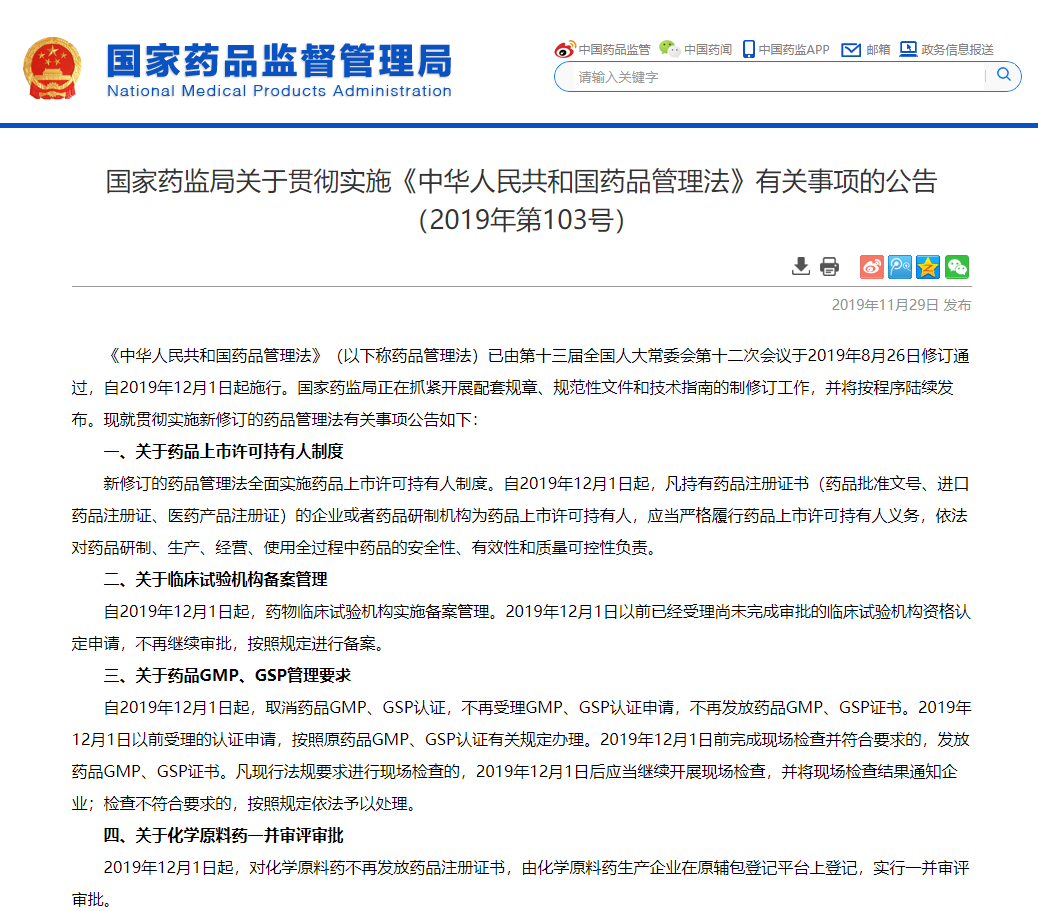 《中華人民共和國藥品管理法》(以下稱藥品管理法)已由第十三屆全國人大常委會第十二次會議于2019年8月26日修訂通過,自2019年12月1日起施行。國家藥監(jiān)局正在抓緊開展配套規(guī)章、規(guī)范性文件和技術(shù)指南...