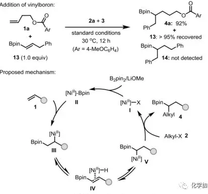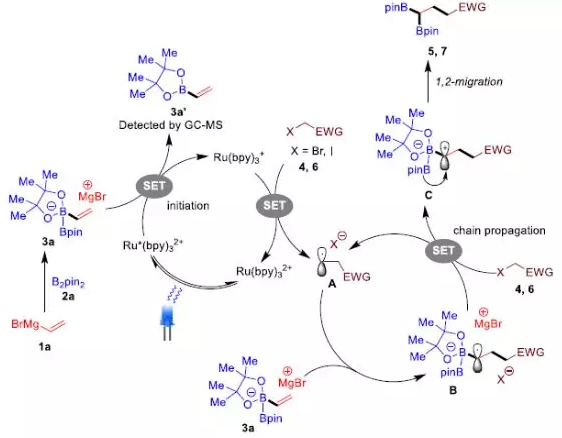 南京大學史壯志課題組報道了第一例可見光介導的烯基二硼酸與烷基鹵化物的加成/1,2-硼酸酯重排串聯(lián)反應,能以較高的收率得到各種偕-二硼酸酯烷烴化合物。作者以烷基溴化物作為烯烴1,2-硼烷遷移反應的偶聯(lián)配...