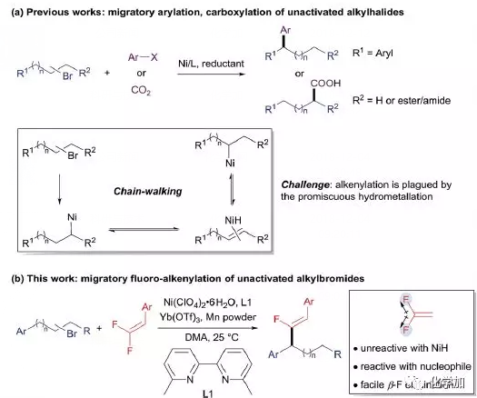 近日,南京工業(yè)大學(xué)馮超教授課題組首次發(fā)展了鎳催化未活化烷基溴化物的的高區(qū)域和立體選擇性遷移氟代烯基化反應(yīng)。相關(guān)研究成果發(fā)表在Chemical Science上(DOI: 10.1039/c8sc041...