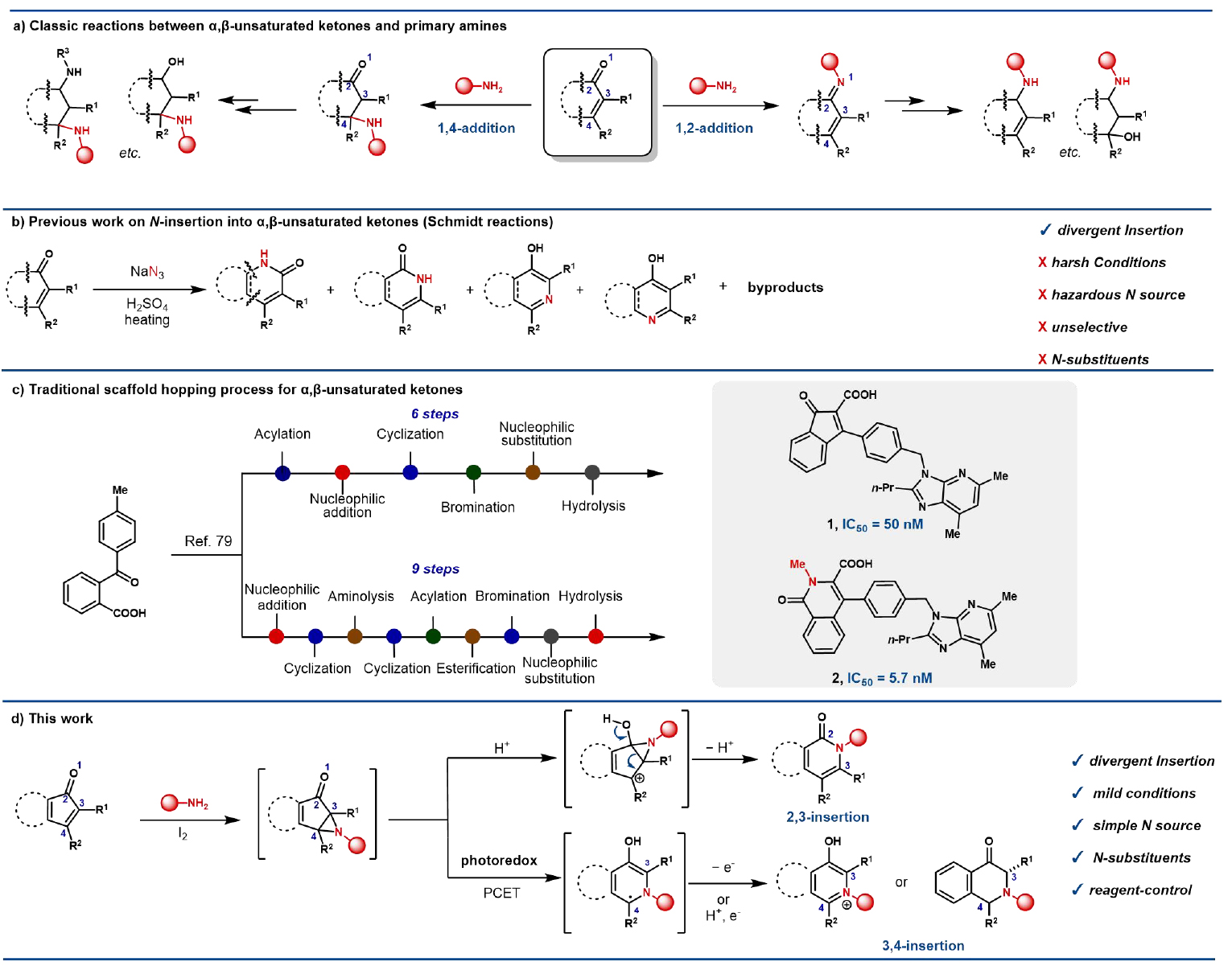 α,β- 不飽和酮作為藥物分子與天然產(chǎn)物中的關(guān)鍵結(jié)構(gòu)單元,其化學(xué)轉(zhuǎn)化長期受限于外圍修飾(如 1,2 - 或 1,4 - 加成),而骨架層面的氮原子插入則依賴傳統(tǒng) Schmidt 反應(yīng) —— 該反應(yīng)需使...