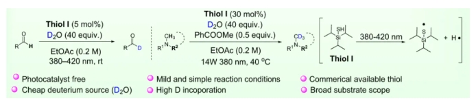 氘代化合物在藥物研發(fā)、材料科學(xué)及機理研究中具有不可替代的價值。因此,開發(fā)出一種操作簡單、成本價廉且高效的合成方法深受研究學(xué)者們的青睞。近日,鄭州大學(xué)的張月騰和王志遠團隊合作通過380-420nm光照激...